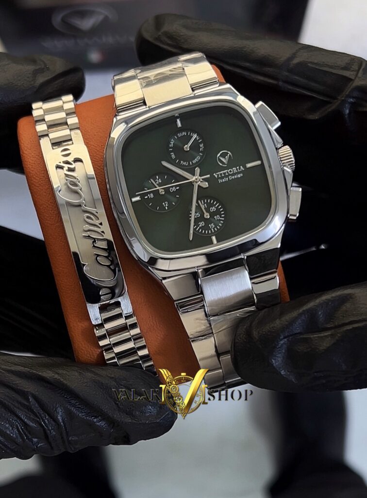 ساعت مردانه ویتوریا مربعی سیلور صفحه سبز vittoria 3185